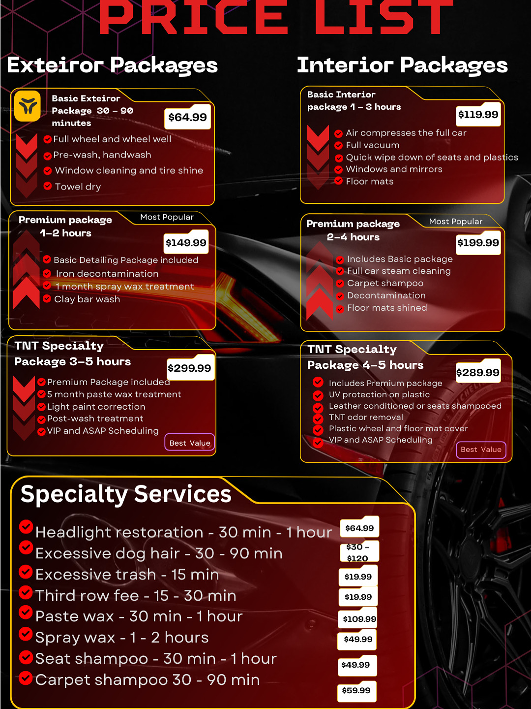 "I got my car detailed by TNT detailing and I couldn't say anything bad about it. The price, cleanliness, and quality was amazing. So worth it! "